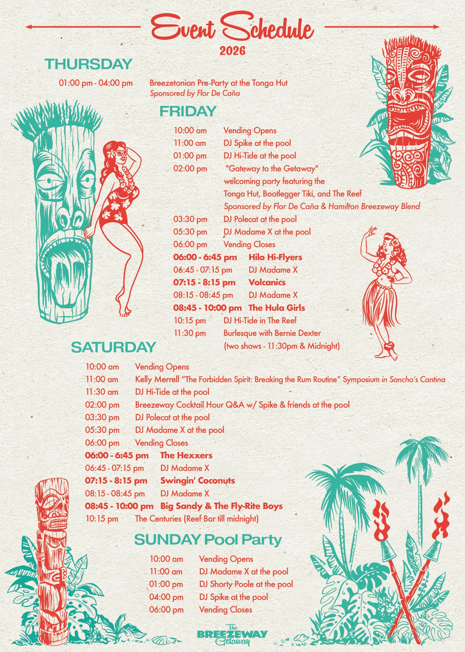 The Breezeway Getaway captures the mystique of mid-century weekenders with the warmth of tiki Ohana. From a meet-and-greet with Spike and stars from The Breezeway Cocktail Hour, to shopping the Village of Island Traders, spirited symposiums, poolside revelry, and nights of music and signature cocktails... every moment is crafted for escape and camaraderie.